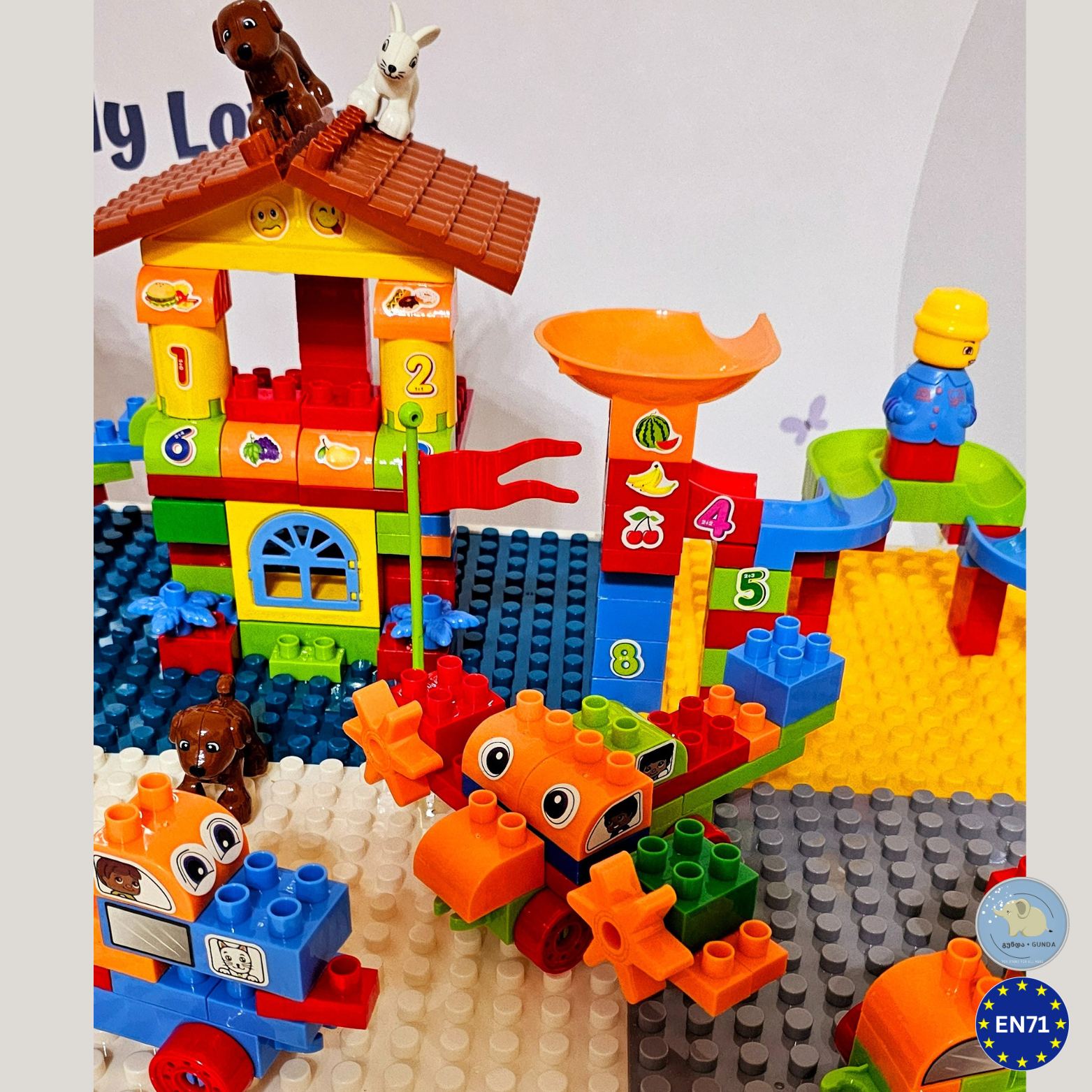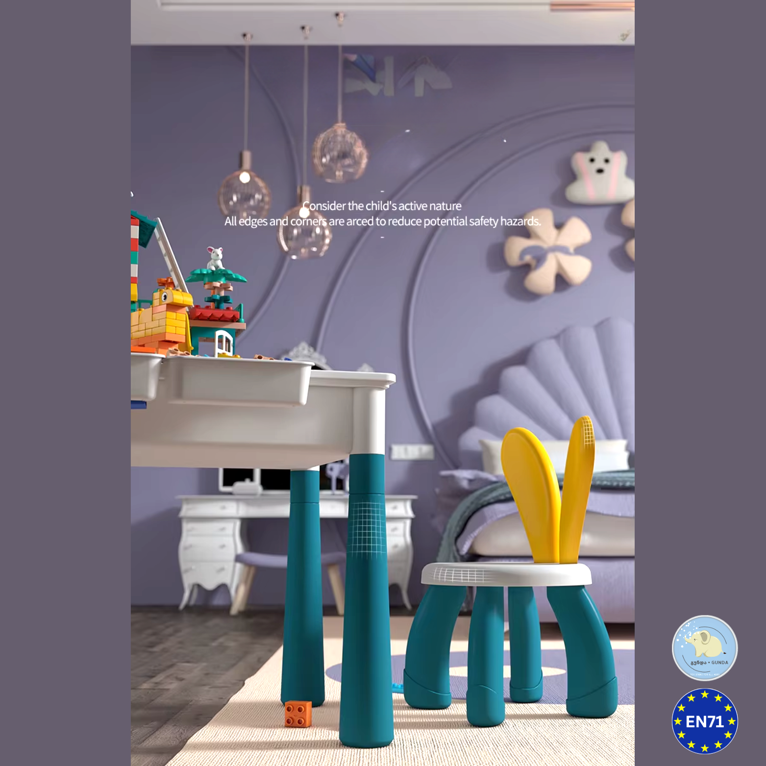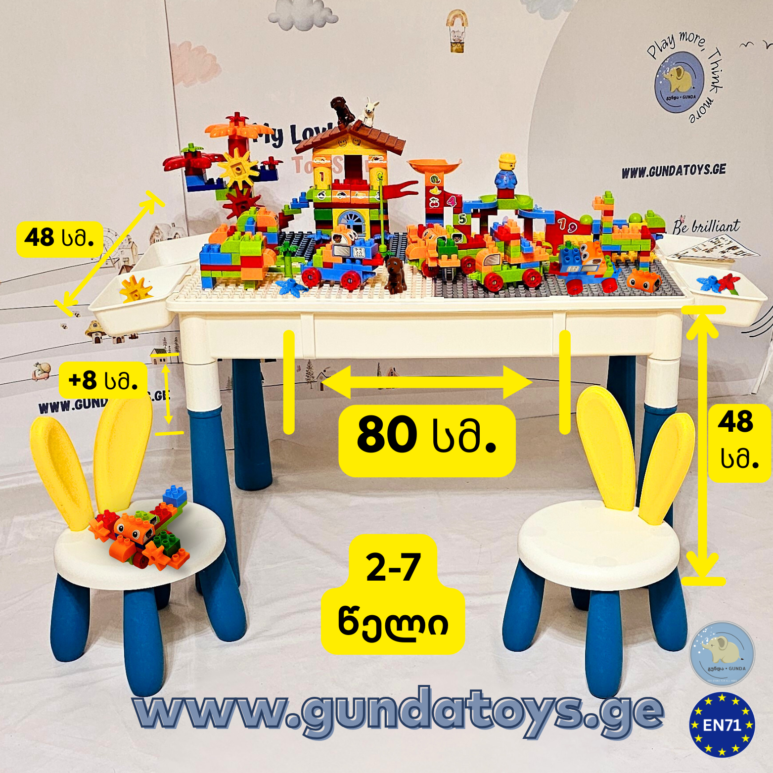 - ტიპი: დიდი ზომის მრავალფუნქციური მაგიდა, 2 სკამით და მრავალფეროვანი სამშენებლო კონსტრუქციებით – Animals house block table