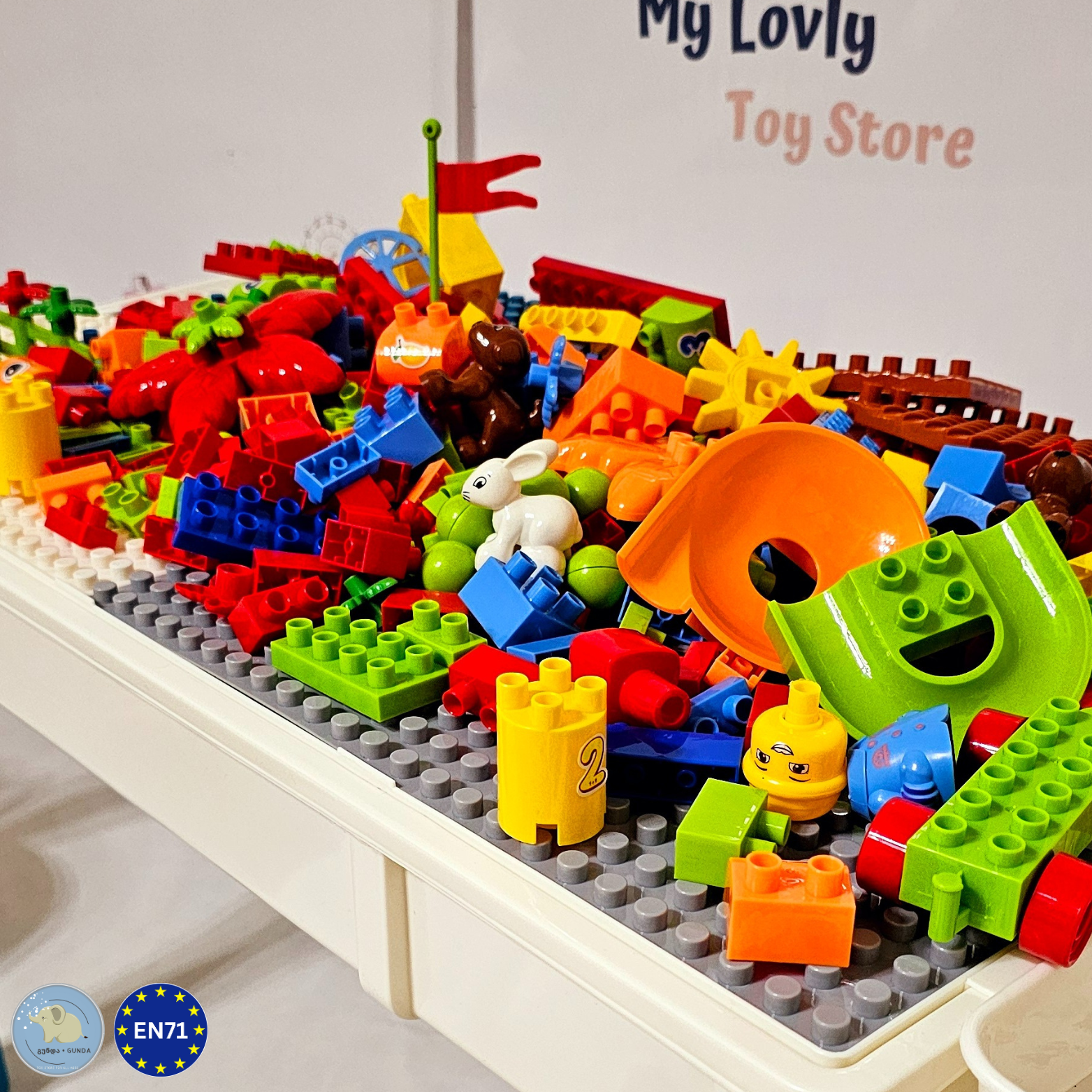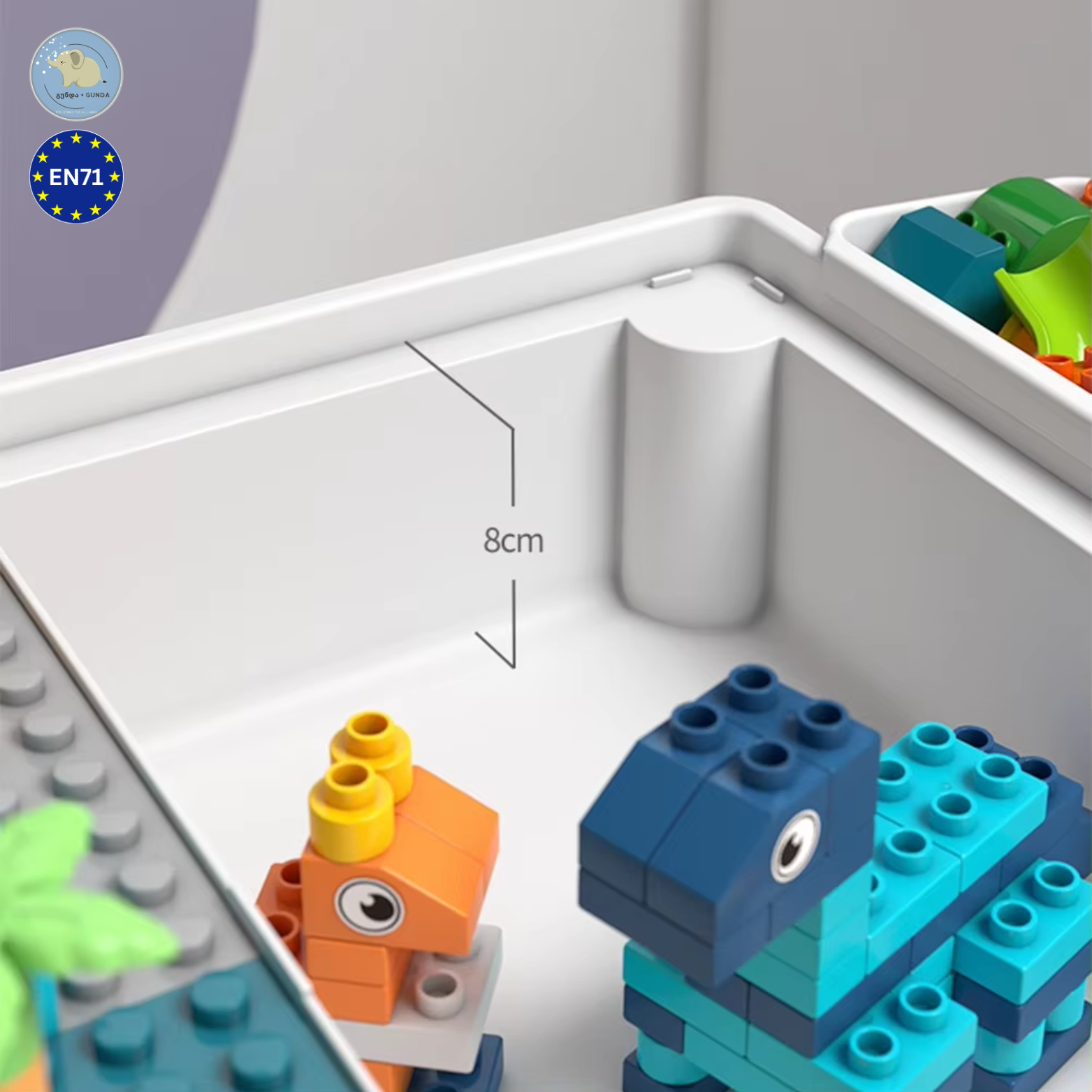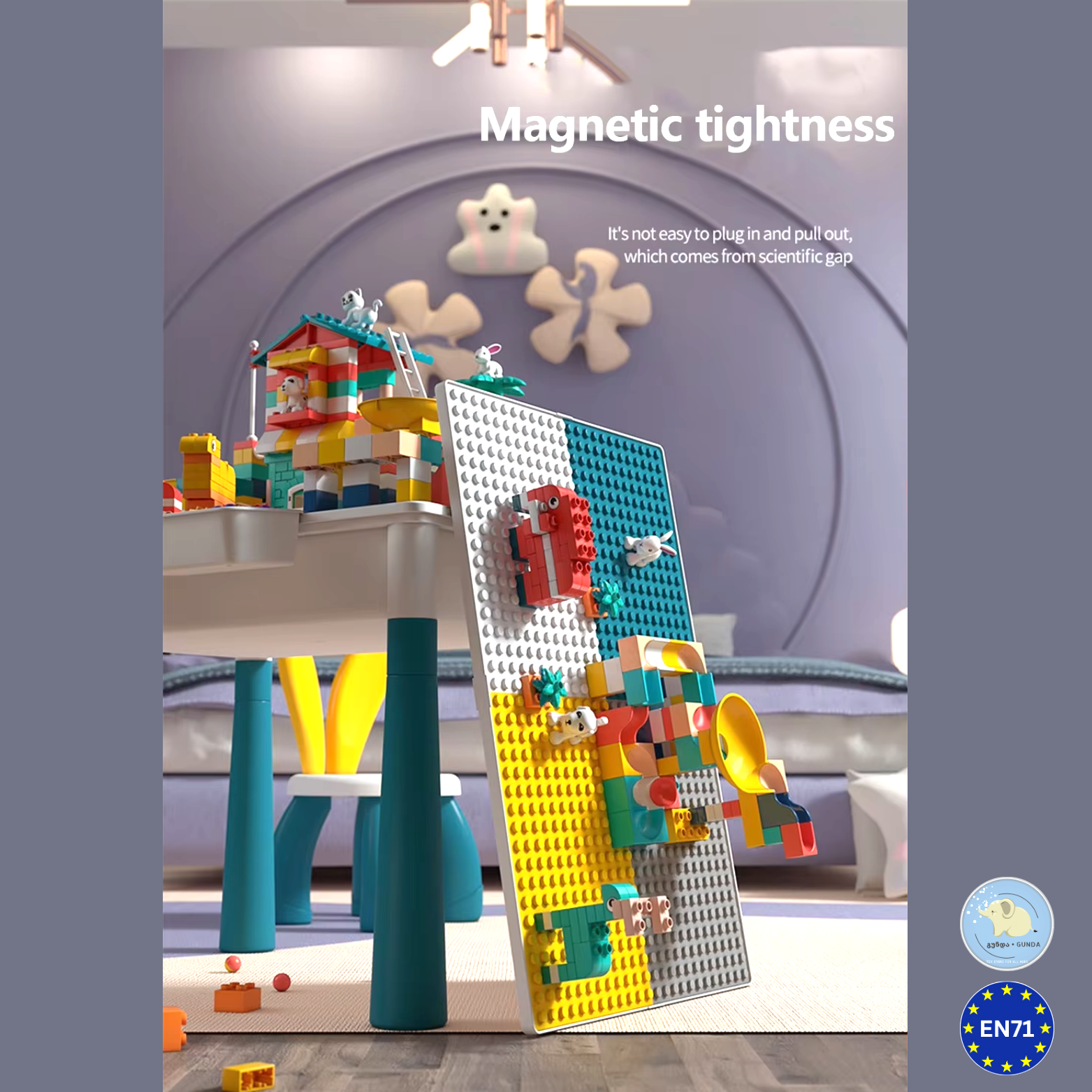 - ტიპი: დიდი ზომის მრავალფუნქციური მაგიდა, 2 სკამით და მრავალფეროვანი სამშენებლო კონსტრუქციებით – Animals house block table