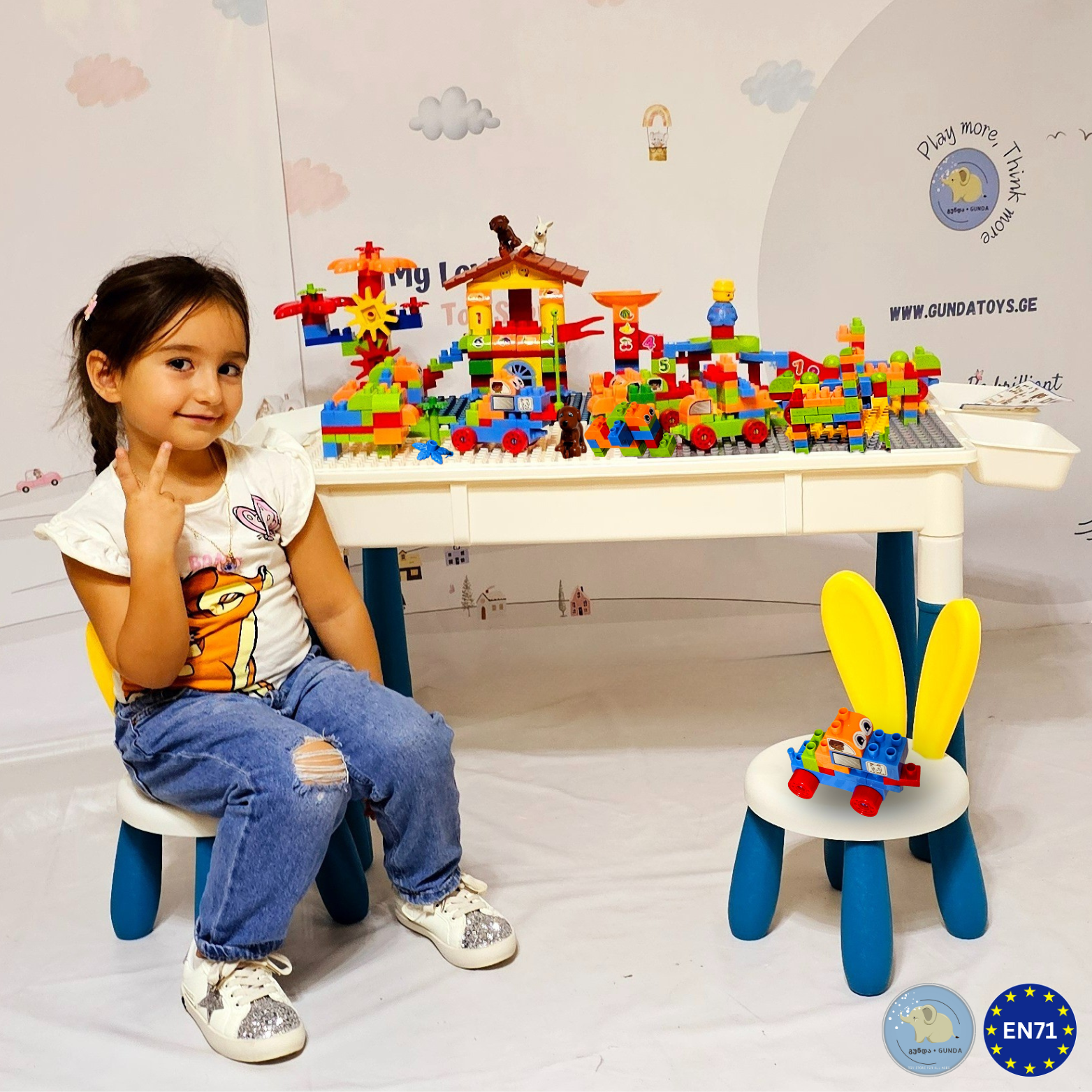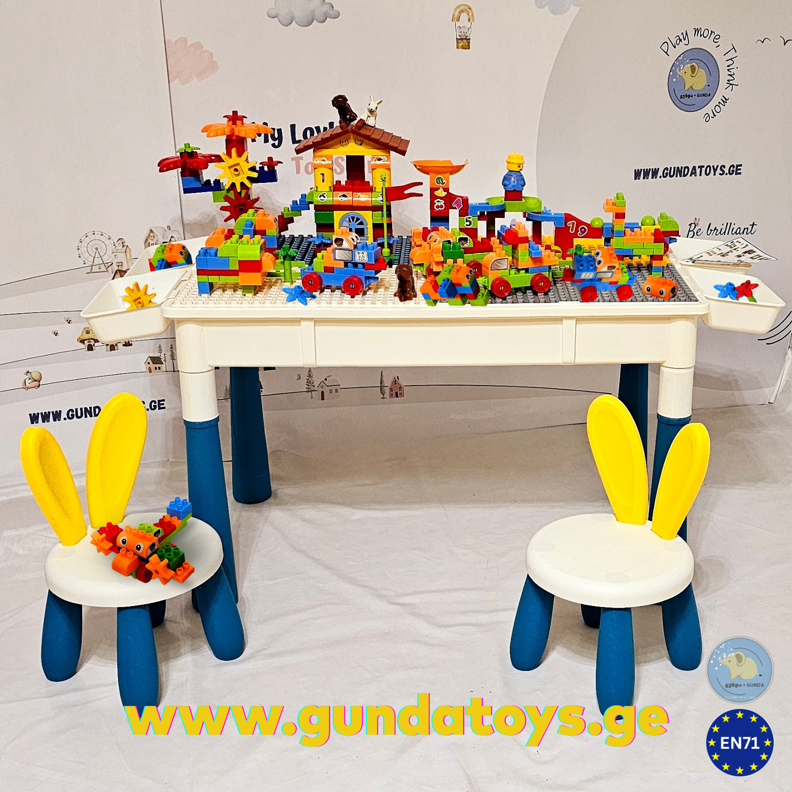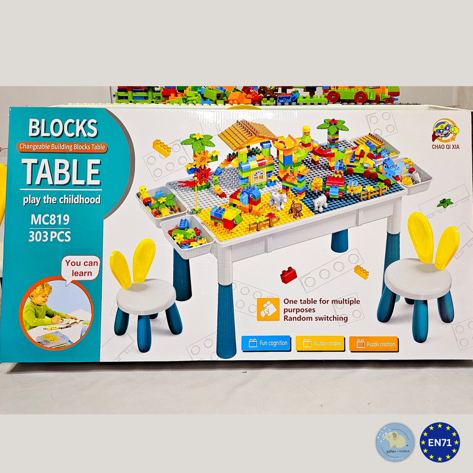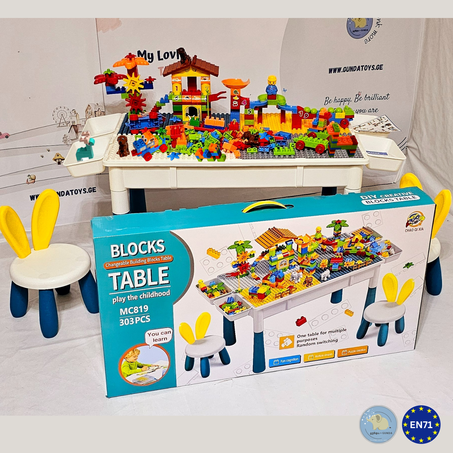 დიდი ზომის მრავალფუნქციური მაგიდა 2 სკამით და მრავალფეროვანი კუბიკებით (303 დეტალით)