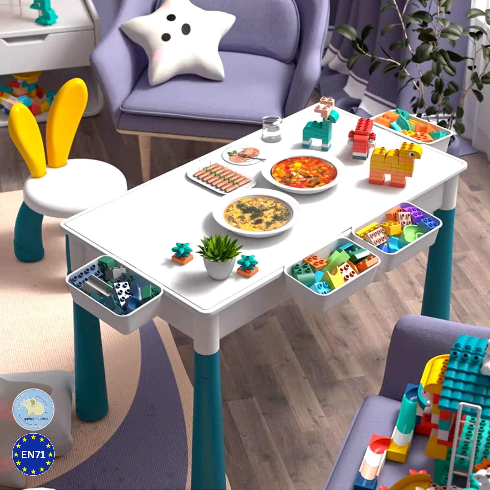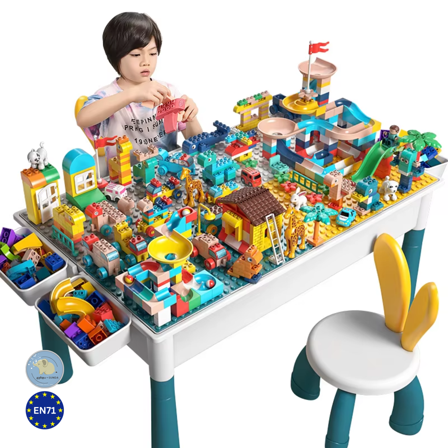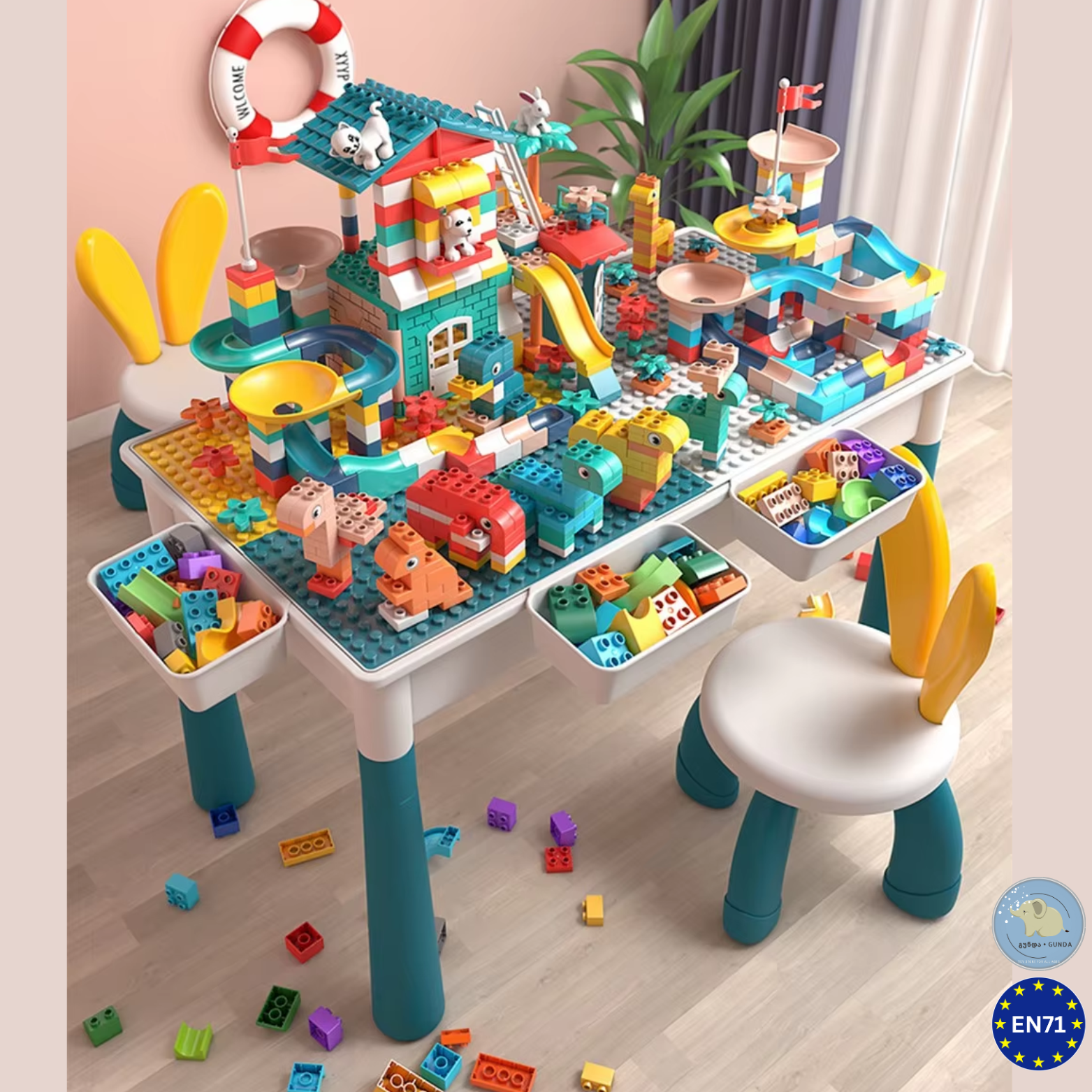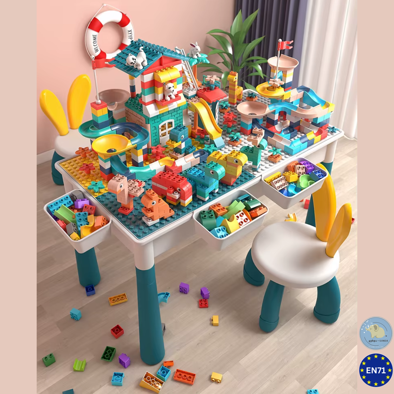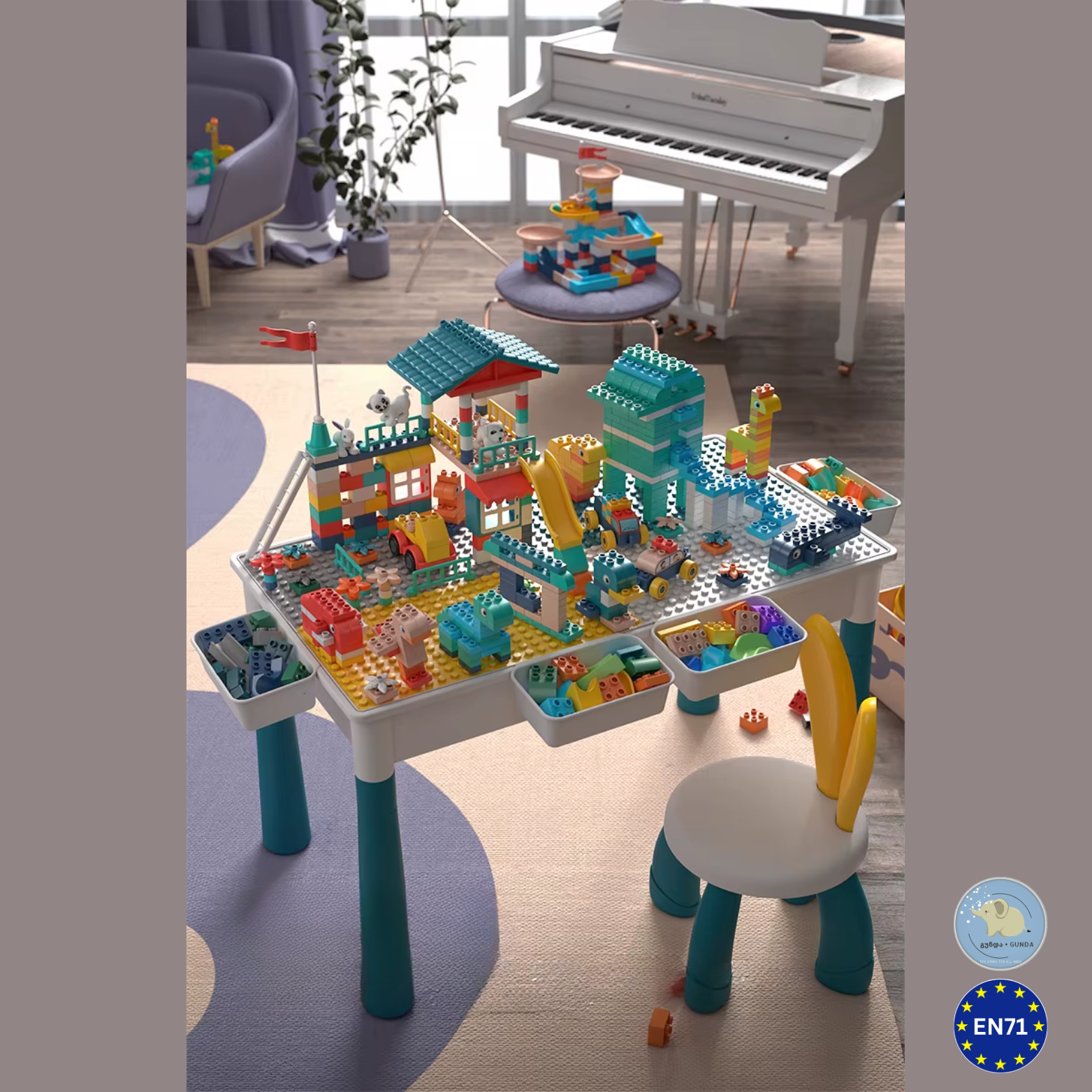 დიდი ზომის მრავალფუნქციური მაგიდა 2 სკამით და მრავალფეროვანი კუბიკებით (303 დეტალით)