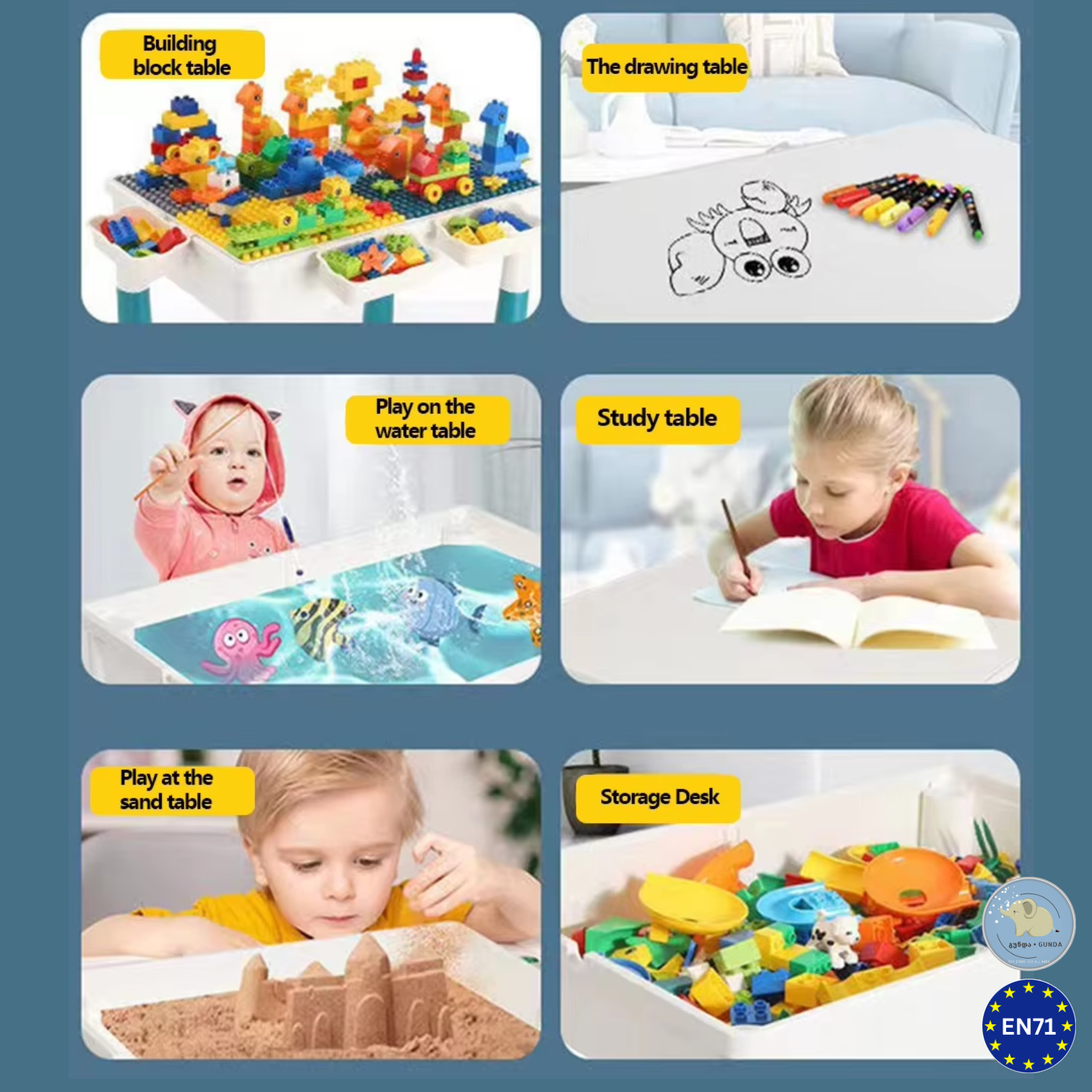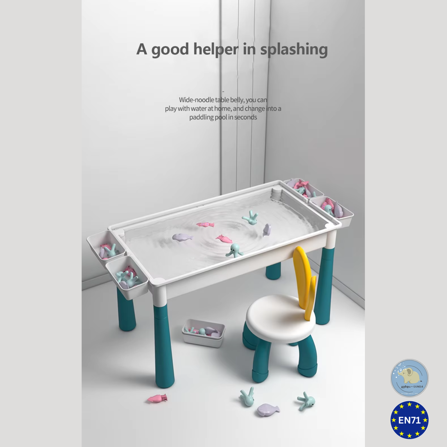 - ფუნქციები: მაგიდა შეიძლება გარდაიქმნას სხვადასხვა საჭიროებების შესაბამისად – 1. მაგიდა კონსტრუქციების ასაგებად; 2. სამეცადინო მაგიდა; 3. ქვიშაში სათამაშო ; 4. წყალში სათამაშოდ, წყლის ავზის გასაკეთებლად სათევზაოდ. 5. საკვები მაგიდა.