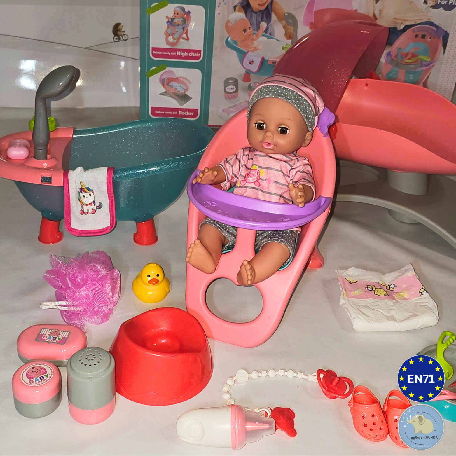 - კომპლექტაცია: თოჯინა, საწოლი, ვანა (დგუშეზე ხელის დაჭერით ცირკულირებს წყალი), საკვები სკამ-მაგიდა, ქოთანი, თეფში, კოვზი, ჩანგალი, საწოვარა, ბოთლი, პამპერსი, ჩუსტები, დასაბანი ღრუბელი, საპნის, პუდრის და კრემის კონტეინერები.
