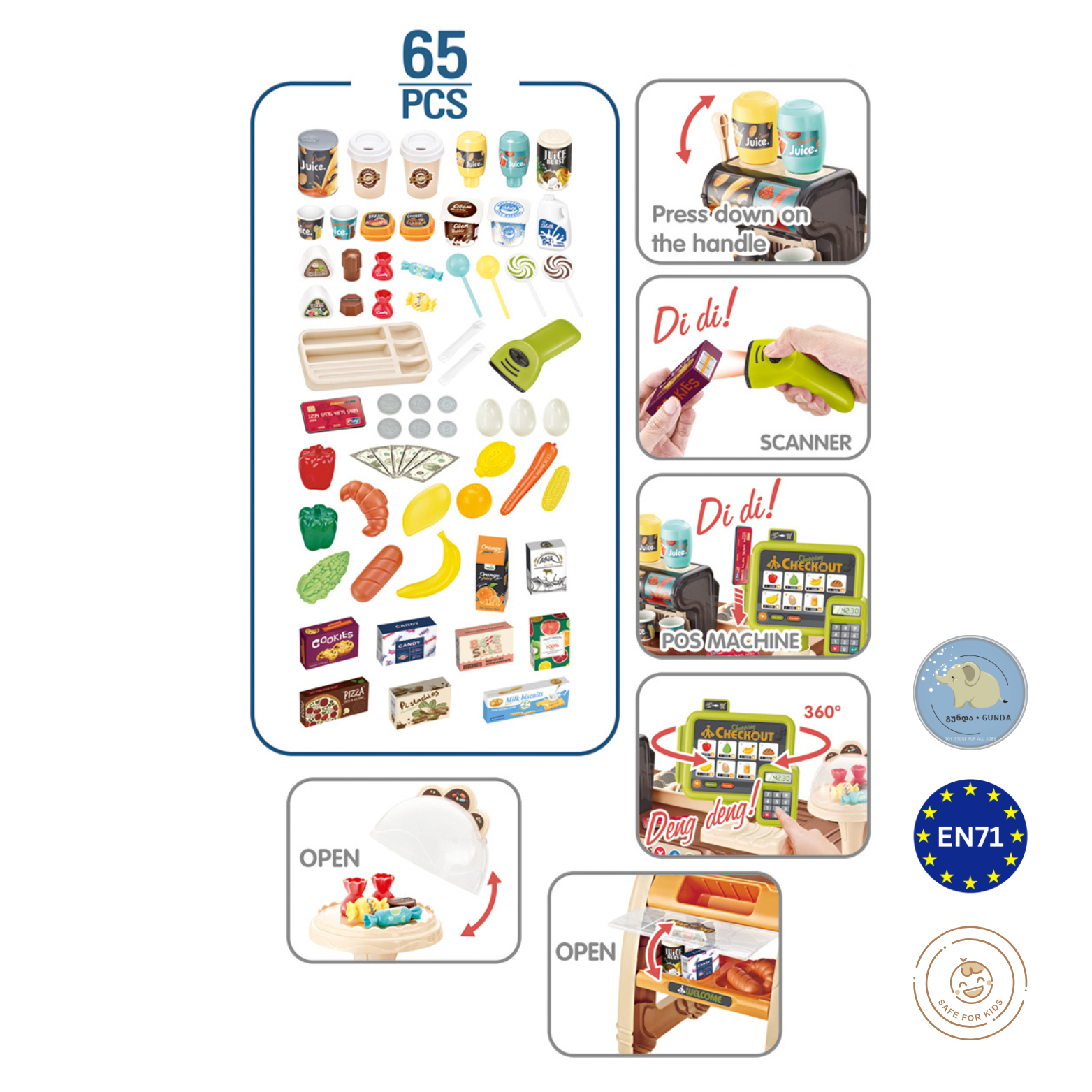 • ტიპი: სათამაშო სუპერმარკეტის კომბინირებული კომპლექტი + ფუნქციური სკანერი, სალარო აპარატი, ბარათის წამკითხველი, წვენის ჩამოსასხმელი