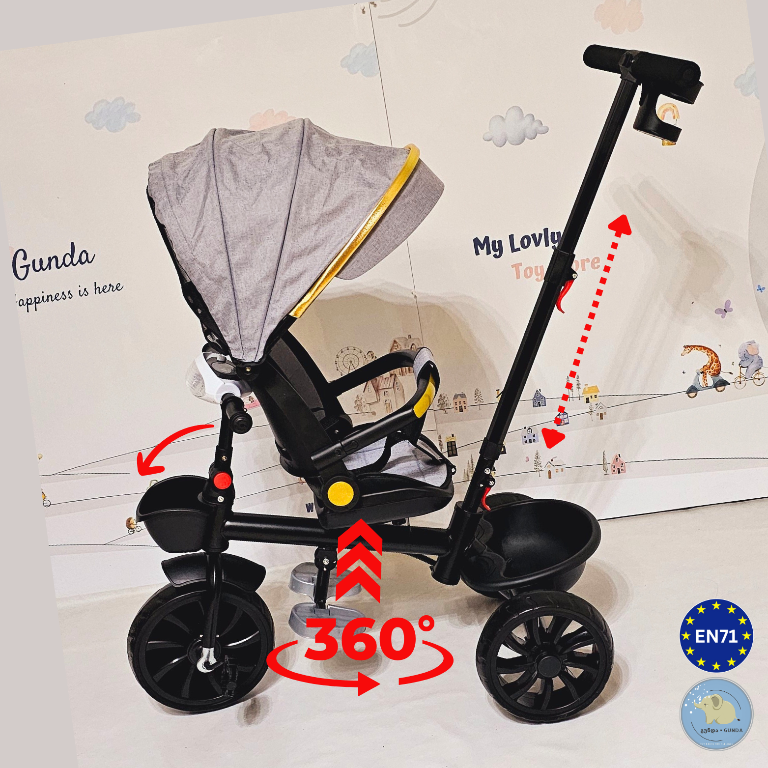 ეტლის სავარძელი, ტრიალებს 360 გრადუსით და გადადის ბოლომდე წოლით პოზიციამდე. აქვს დამატებითი ფეხის დასადები როგორც ჩვილისთვის, ასევე შემდეგ, უკვე ჯდომით პოზიციაში მყოფი პატარისთვის. საჭე შეგიძლიათ მოხსნათ პირველ ეტაპზე, როდესაც იყენებთ როგორც ეტლს ჩვილისთვის და შემდეგ დაუყენოთ, როდესაც ველოსიპედის გამოყენების დრო მოვა. მარტივად იწყობა, ეხსნება და უყენდება დეტალები.
